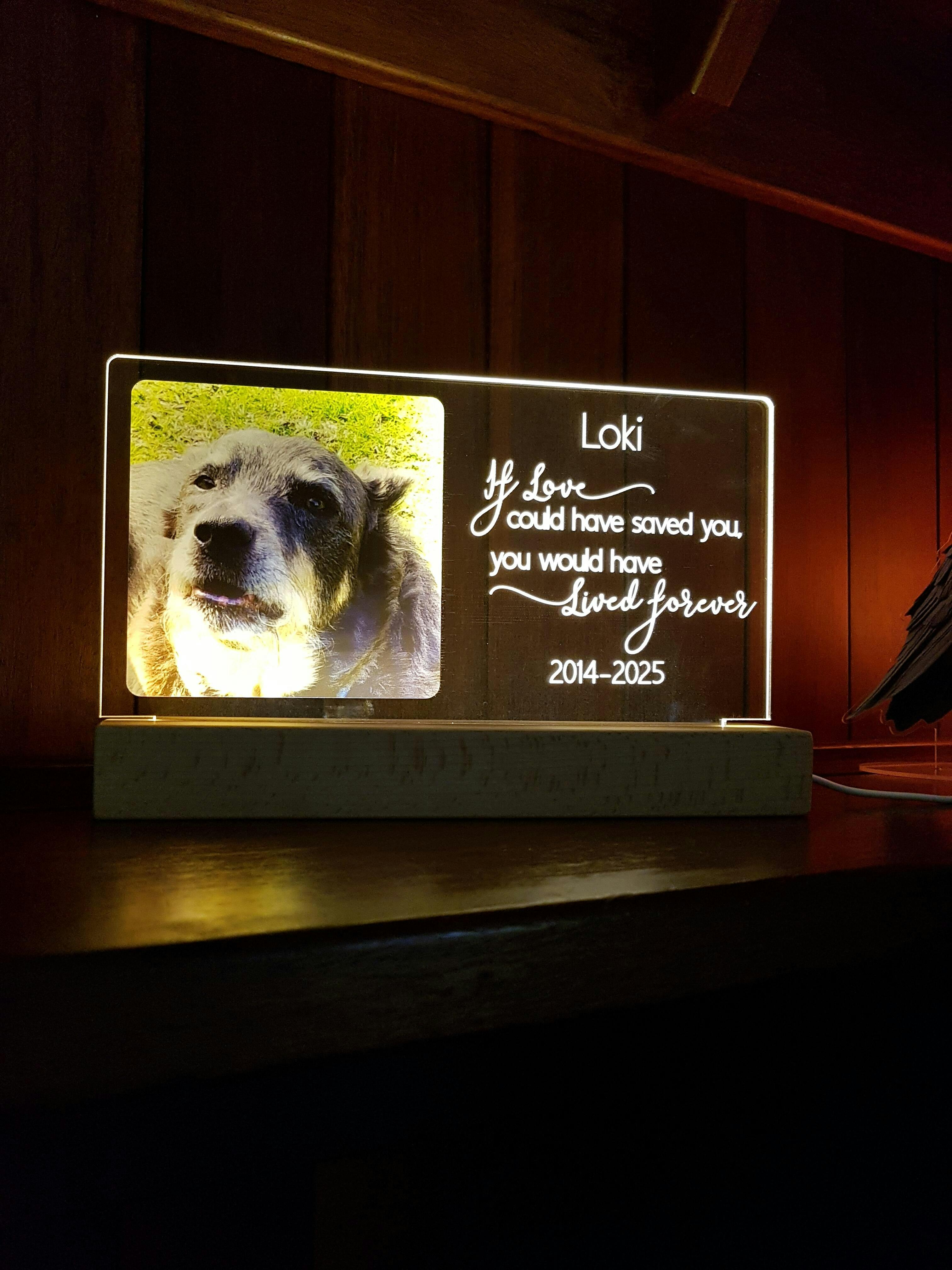 This beautiful memorial plaque is printed with a photo and name of your loved one and a beautiful saying “If love could have saved you, You would have lived forever” The clear acrylic is printed with you image on the reverse side, so even when not lit up it looks like it’s behind glass.
