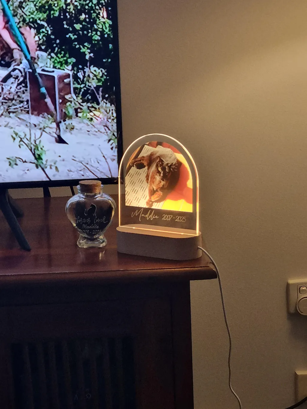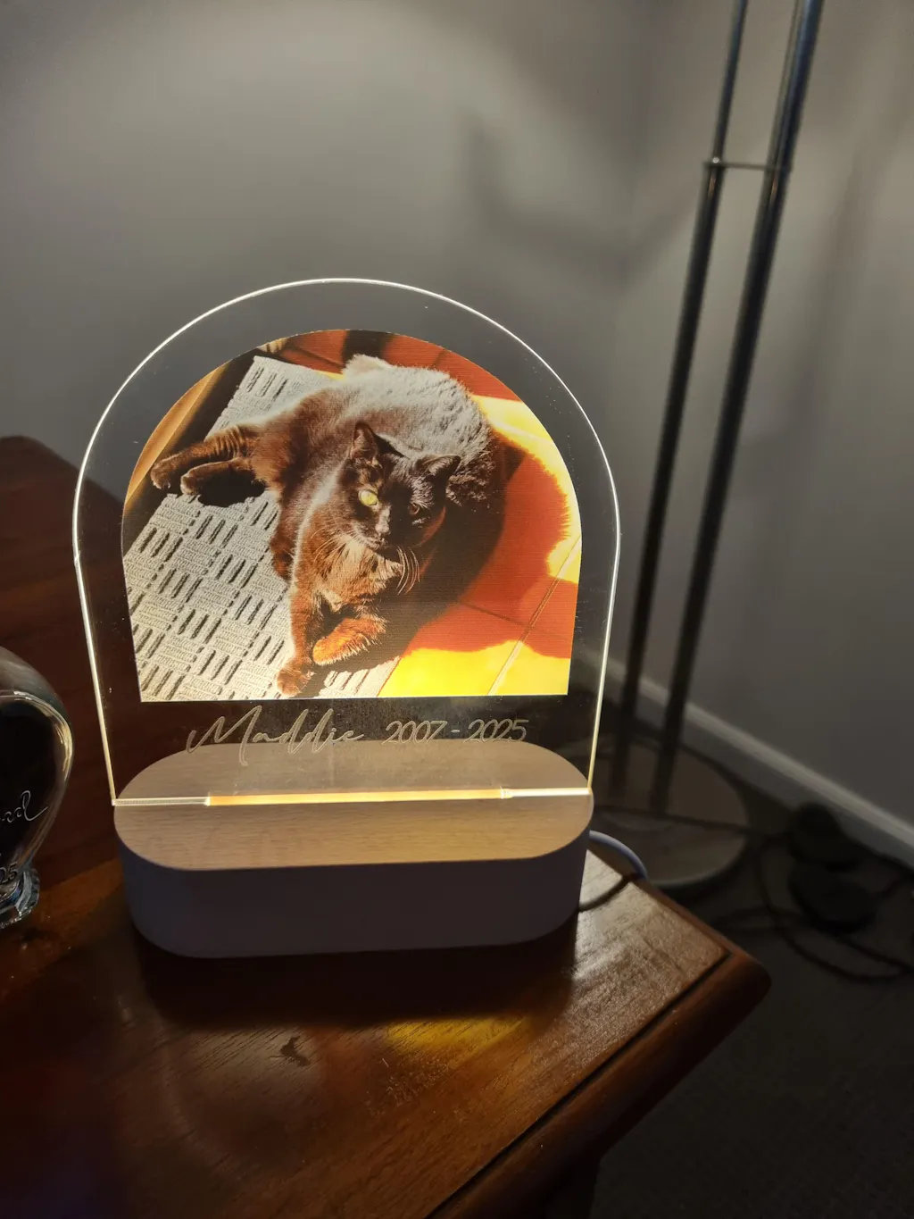 By day, it displays a treasured photo with quiet elegance. By night, it glows softly — offering comfort in still moments and symbolising the love that continues to shine long after goodbye. It’s a gentle, lasting way to keep them close.