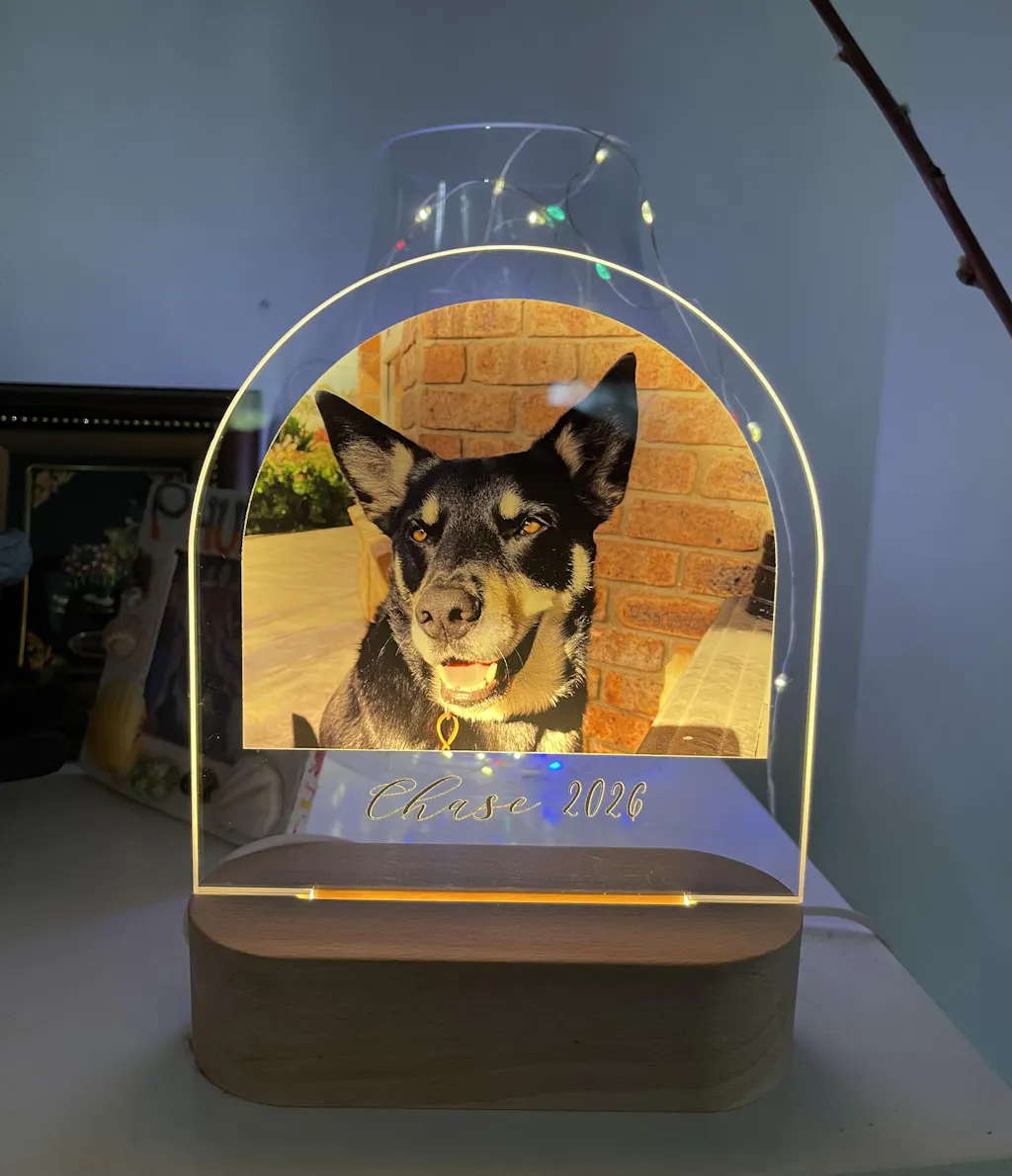 Our Personalised Pet Memorial LED Light Plaque is a beautiful tribute designed to gently illuminate the memory of your beloved companion. Standing 19cm tall, this elegant keepsake features your chosen photo and your pet’s name, creating a glowing reminder of the love you’ll always carry.